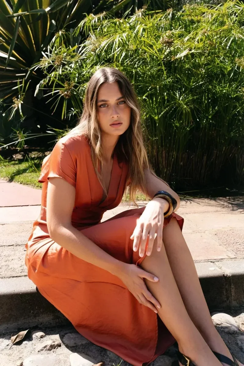 Cette robe satin orange présente un décolleté cache-cœur qui met en valeur votre buste tout en garantissant une allure raffinée. Sa coupe midi, légèrement évasée, se marie parfaitement à des talons ou des chaussures plus décontractées, vous permettant de passer d’une journée au bureau à une soirée élégante sans effort. Le satin, avec son effet légèrement brillant, capte la lumière et attire les regards.