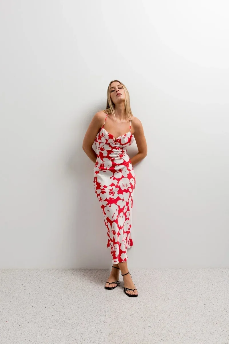 Ne manquez pas l’occasion de briller avec cette robe camisole satinée rouge à imprimé floral. Commandez dès maintenant et stylez-vous avec audace ! ✨