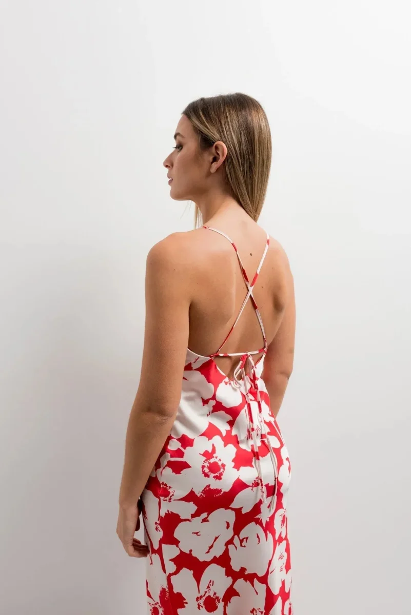 Robe satinée rouge imprimé floral dos nu bretelles croisées