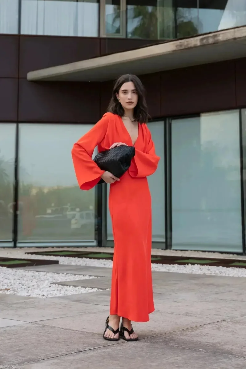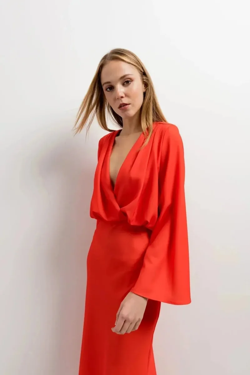 Robe Satinée Rouge Midi Croisée Avec Décolleté Plongeant Et Manches Longues Évasées