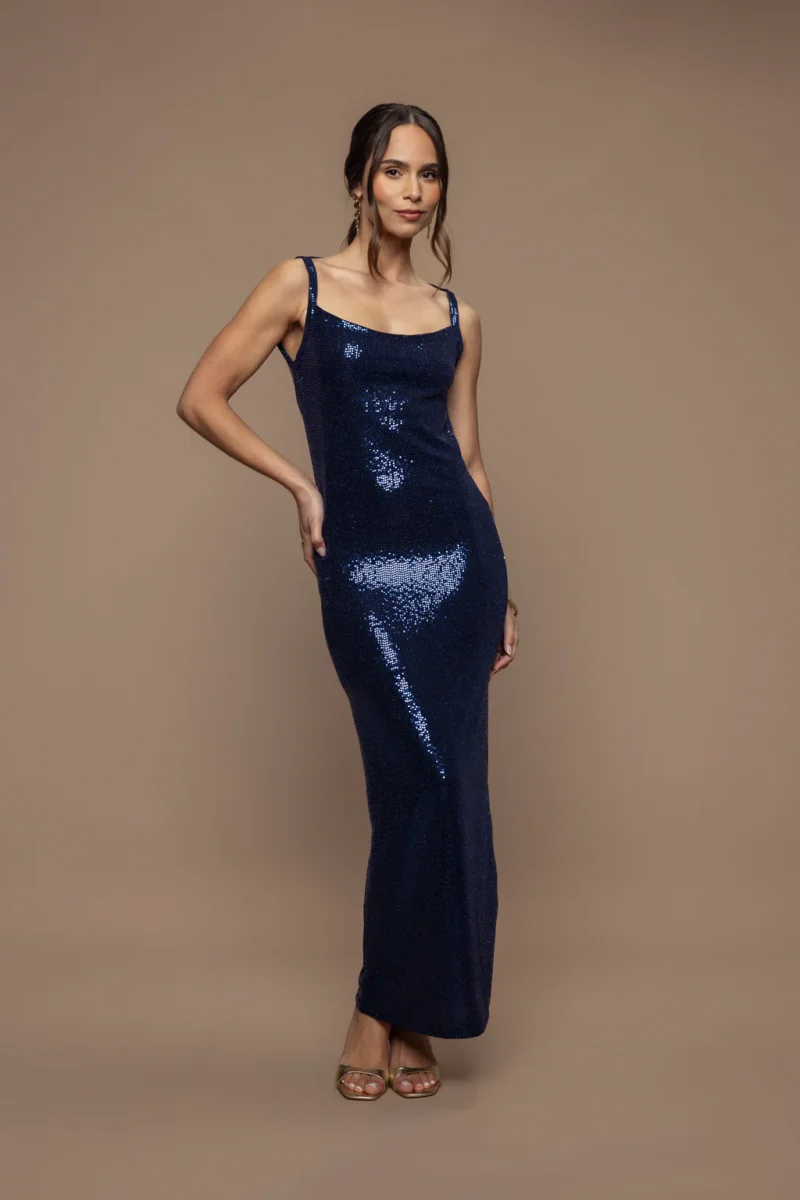 Pardon, mais je ne m’excuse pas de briller. Robe longue en sequins, coupe affûtée, dos subtilement dénudé, pensée pour capter chaque reflet et chaque regard.