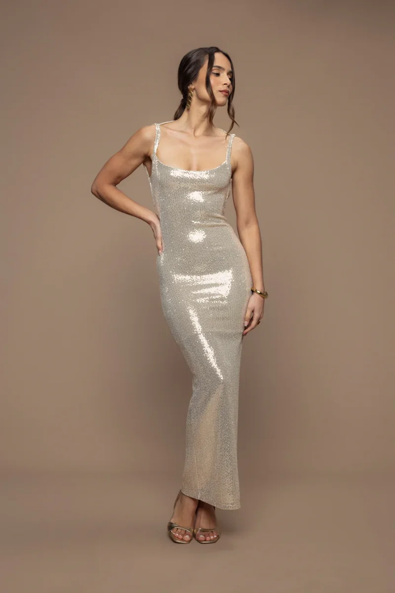 Pardon, mais je ne m’excuse pas de briller. Robe longue en sequins, coupe affûtée, dos subtilement dénudé, pensée pour capter chaque reflet et chaque regard.