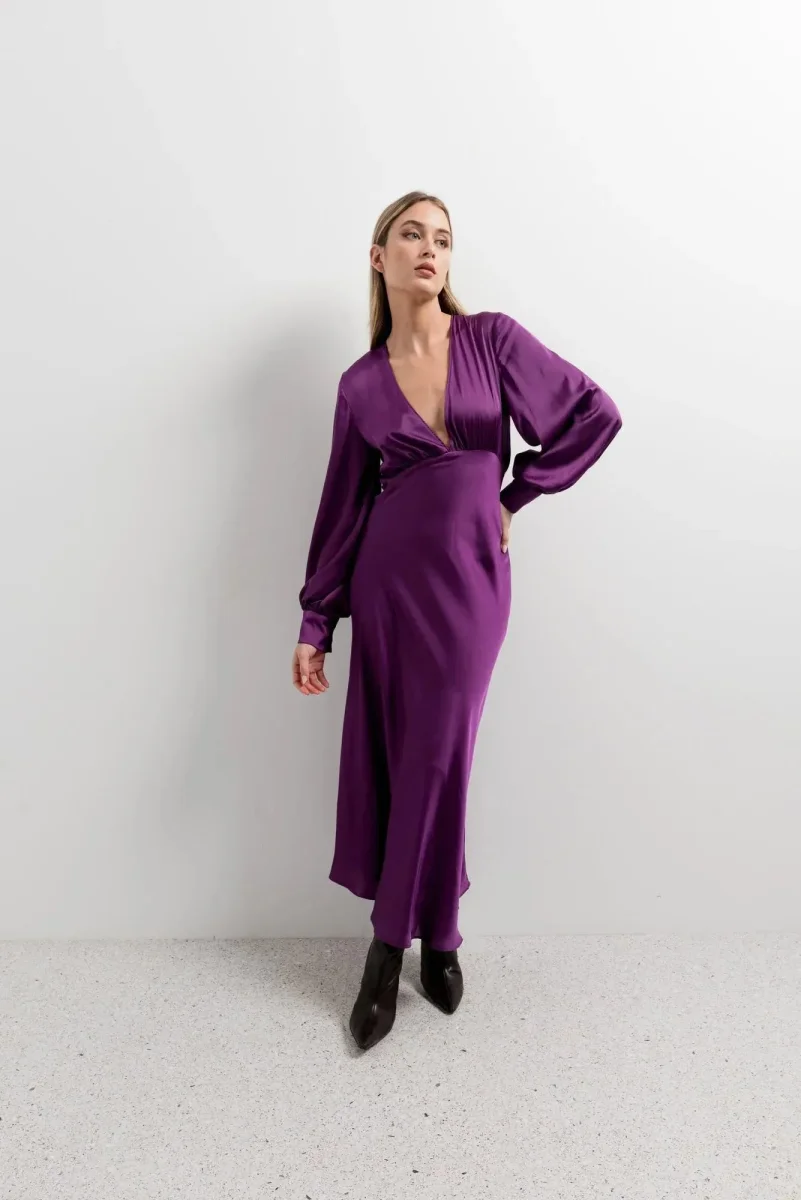 Robe Soirée En Satin Midi Violette À Manches Longues, Élégante Et Confortable