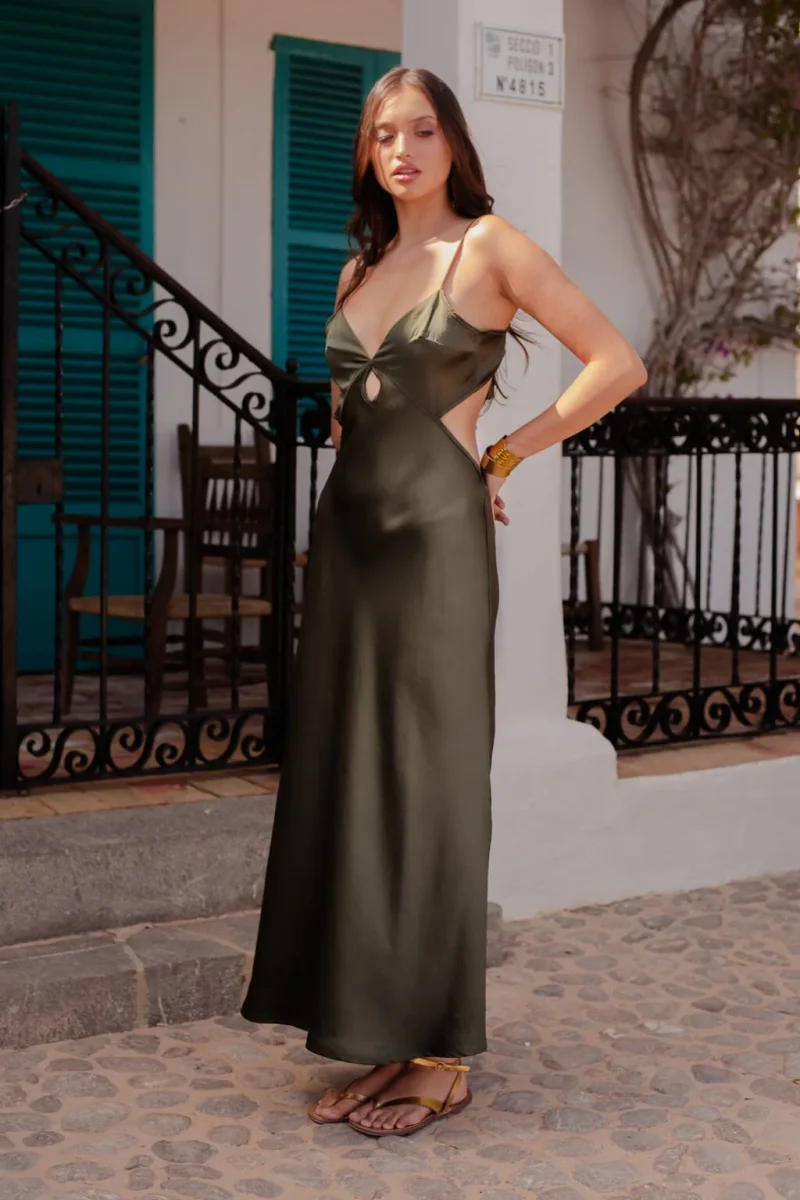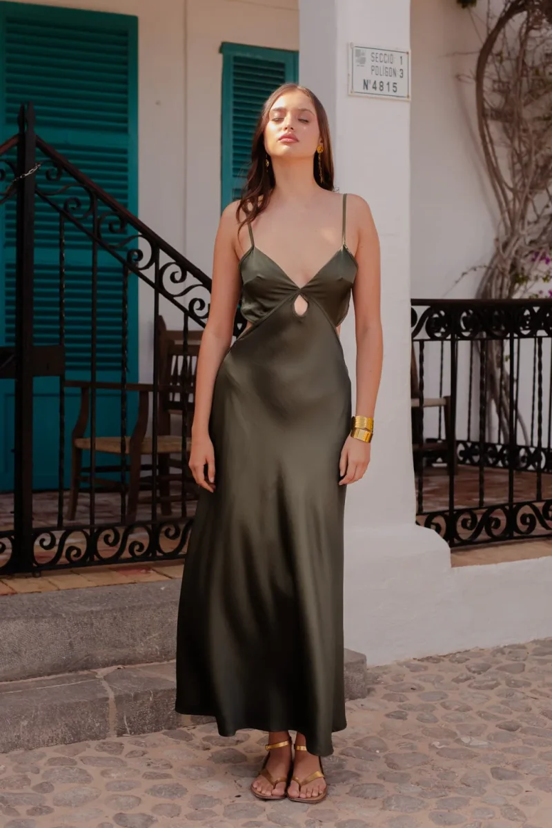 La Robe Triomphante incarne une sophistication subtile et une allure captivante. Confectionnée en satin kaki luxueux, cette robe longue fluide est dotée de fines bretelles réglables qui assurent un ajustement parfait. La fonctionnalité de nouage dans le dos et un dos nu élégant révèlent une touche de peau, tandis que le décolleté en V est sublimé par une découpe en forme de goutte, ajoutant une nuance de sensualité. Une taille élastiquée dans le dos garantit confort et style, faisant de cette robe un choix exquis pour les soirées élégantes ou les grandes occasions.