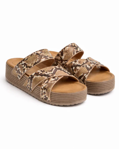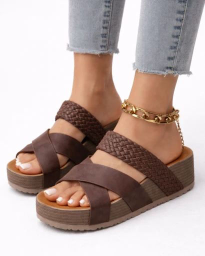 Ces sandales compensées affichent une silhouette moderne et affirmée qui apporte du caractère à une tenue estivale. Leur design à brides croisées structure élégamment l’avant du pied tandis que la bride supérieure tressée ajoute un relief visuel raffiné et une touche de texture distinctive. La semelle épaisse compensée renforce la présence stylistique du modèle et crée un profil contemporain parfaitement équilibré. Faciles à enfiler, elles complètent naturellement une silhouette décontractée ou habillée légère, offrant un rendu tendance et maîtrisé pour accompagner les looks du quotidien.