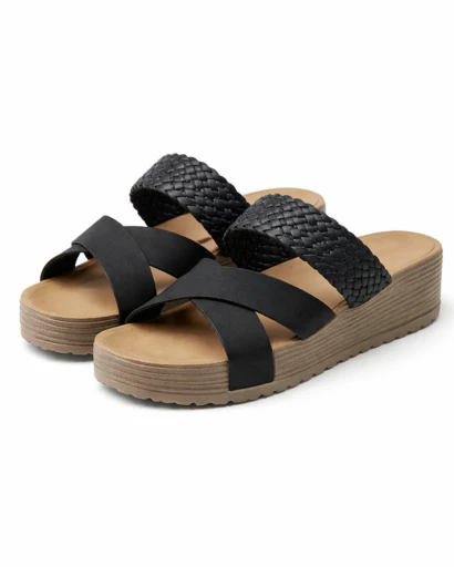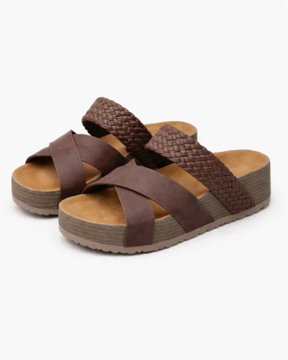 • Design — Brides croisées, bride supérieure tressée, semelle épaisse texturée