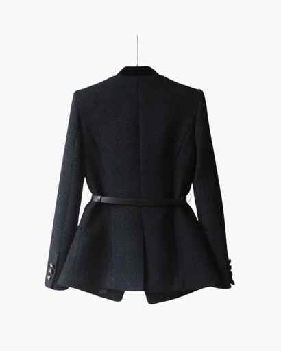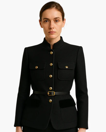 Veste femme élégante au design structuré, conçue pour sublimer la silhouette grâce à une coupe cintrée et équilibrée. Les boutons décoratifs et la ceinture intégrée apportent une touche raffinée, idéale pour un look soigné et contemporain.