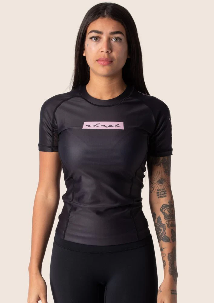 Womens Original Rashguard in Pink On Black. Model’s height: 158cm/5’5″Model’s weight: 55kg/121lbs Model is wearing size: Extra Small (XXS)